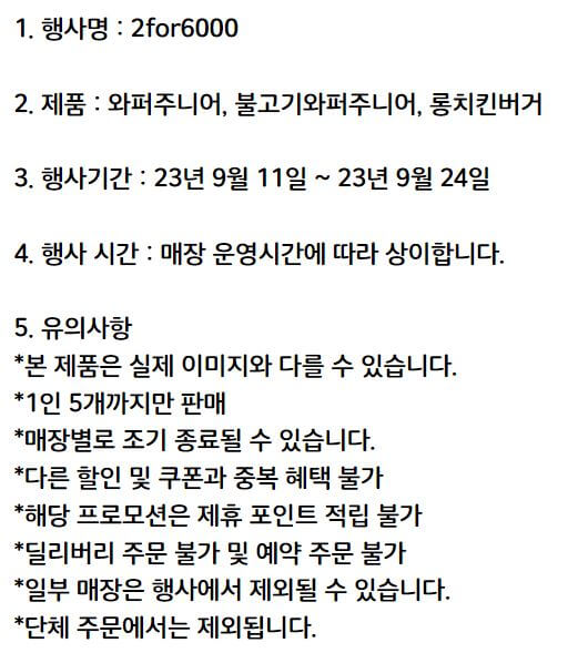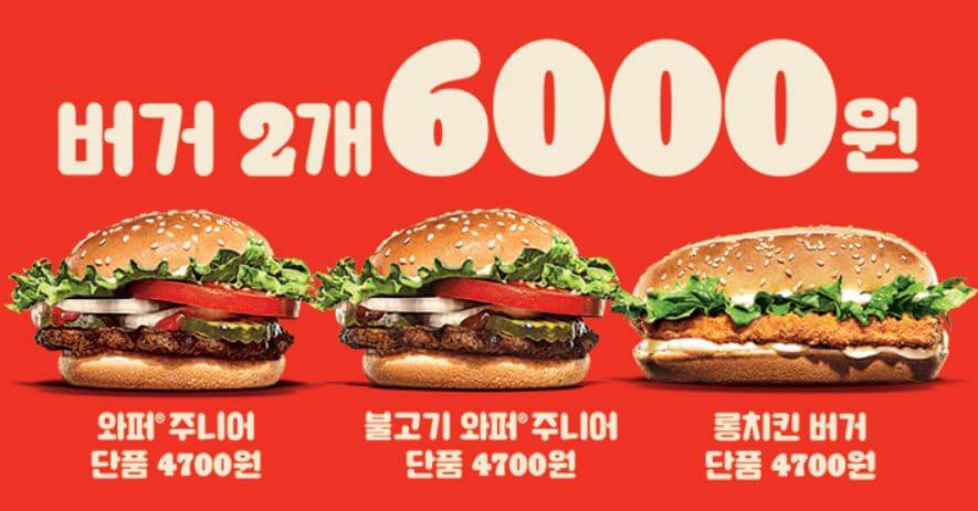 버거킹 9월행사에는 2가지 이벤트가 있습니다. 하나는 햄버거 2개 6000원에 판매하는 프로모션입니다.
